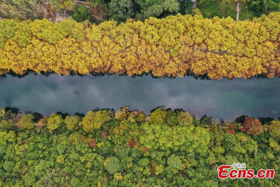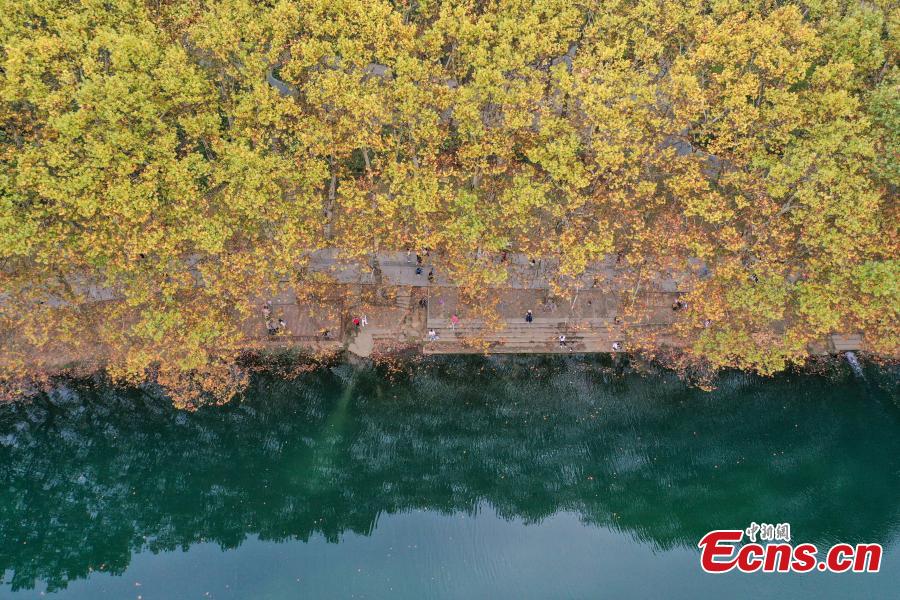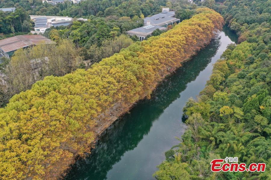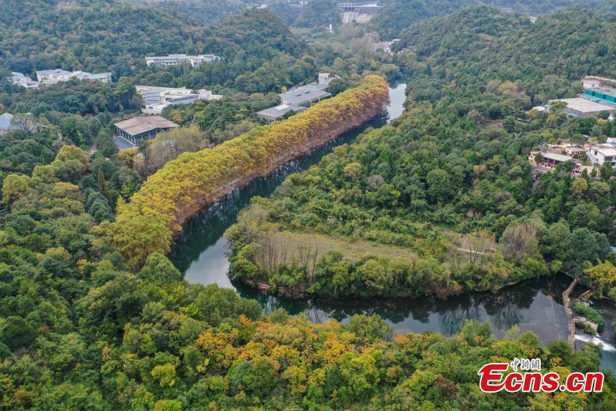 Gorgeous plane trees turn golden along the banks of the Huaxi River in Guiyang, southwest China's Guizhou Province, Oct. 24, 2022. (Photo: China News Service/Qu Honglun)