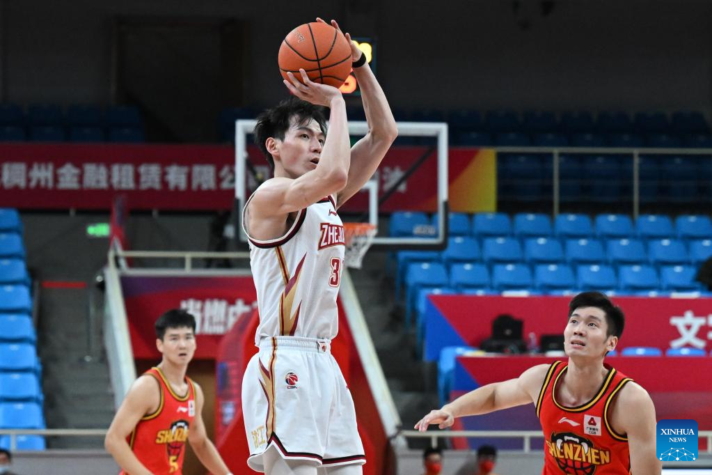 Wu Qian (C) of Zhejiang Golden Bulls shoots during the 7th round match between Zhejiang Golden Bulls and Shenzhen Leopards at the 2022-2023 season of the Chinese Basketball Association (CBA) league in Hangzhou, east China's Zhejiang Province, Oct. 24, 2022. (Xinhua/Chen Zhenhai)