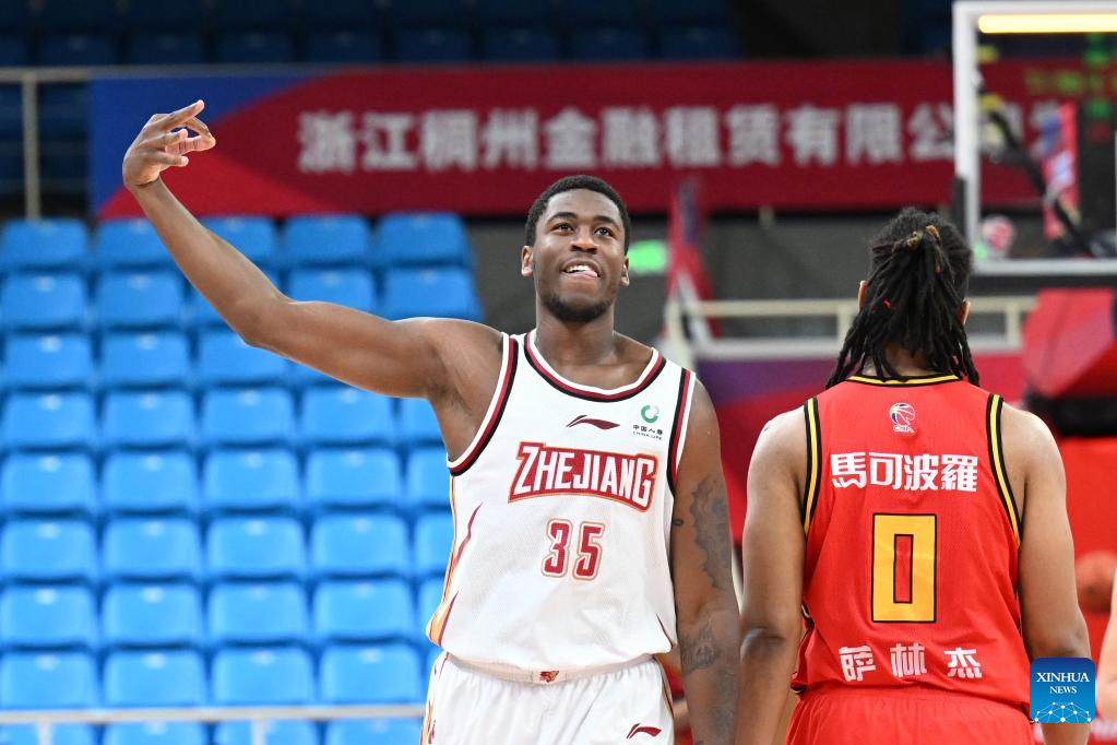 Moses Wright (L) of Zhejiang Golden Bulls celebrates scoring during the 7th round match between Zhejiang Golden Bulls and Shenzhen Leopards at the 2022-2023 season of the Chinese Basketball Association (CBA) league in Hangzhou, east China's Zhejiang Province, Oct. 24, 2022. (Xinhua/Chen Zhenhai)