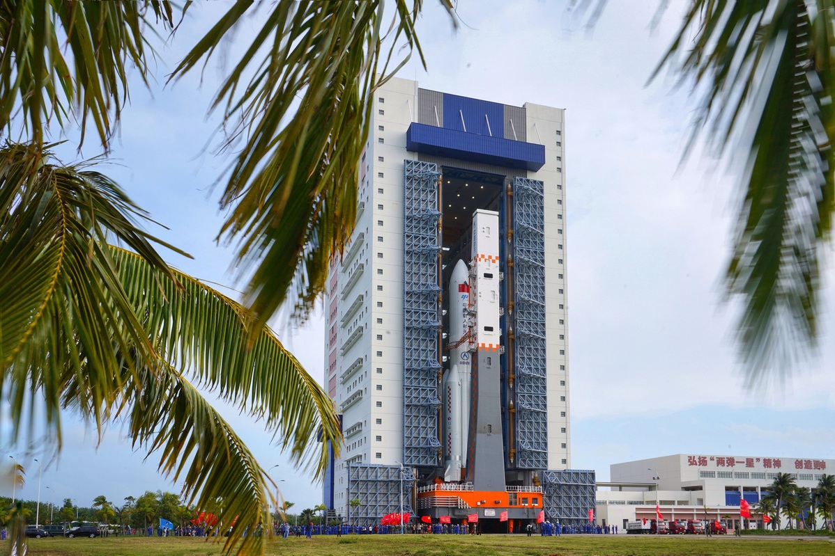 A photo shows China's Mengtian space lab module and its carrier, a Long March 5B rocket, being transported to a service tower at the Wenchang Space Launch Center in Hainan province, Oct 25, 2022. [Photo by Su Dong/For chinadaily.com.cn]