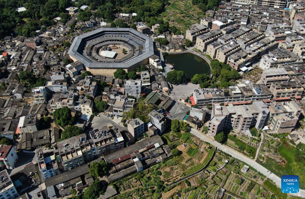 This aerial photo taken on Oct. 21, 2022 shows Daoyun Lou, an octagonal Tulou earthen building compound in Raoping County of Chaozhou, south China's Guangdong Province.