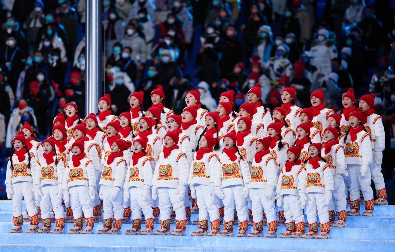 Photo taken on Feb. 4, 2022 shows the Malanhua children’s choir singing the Olympic Anthem in Greek at the opening ceremony of the 24th Olympic Winter Games at the National Stadium, also known as "Bird's Nest" in Beijing. (Xinhua/Cao Can)