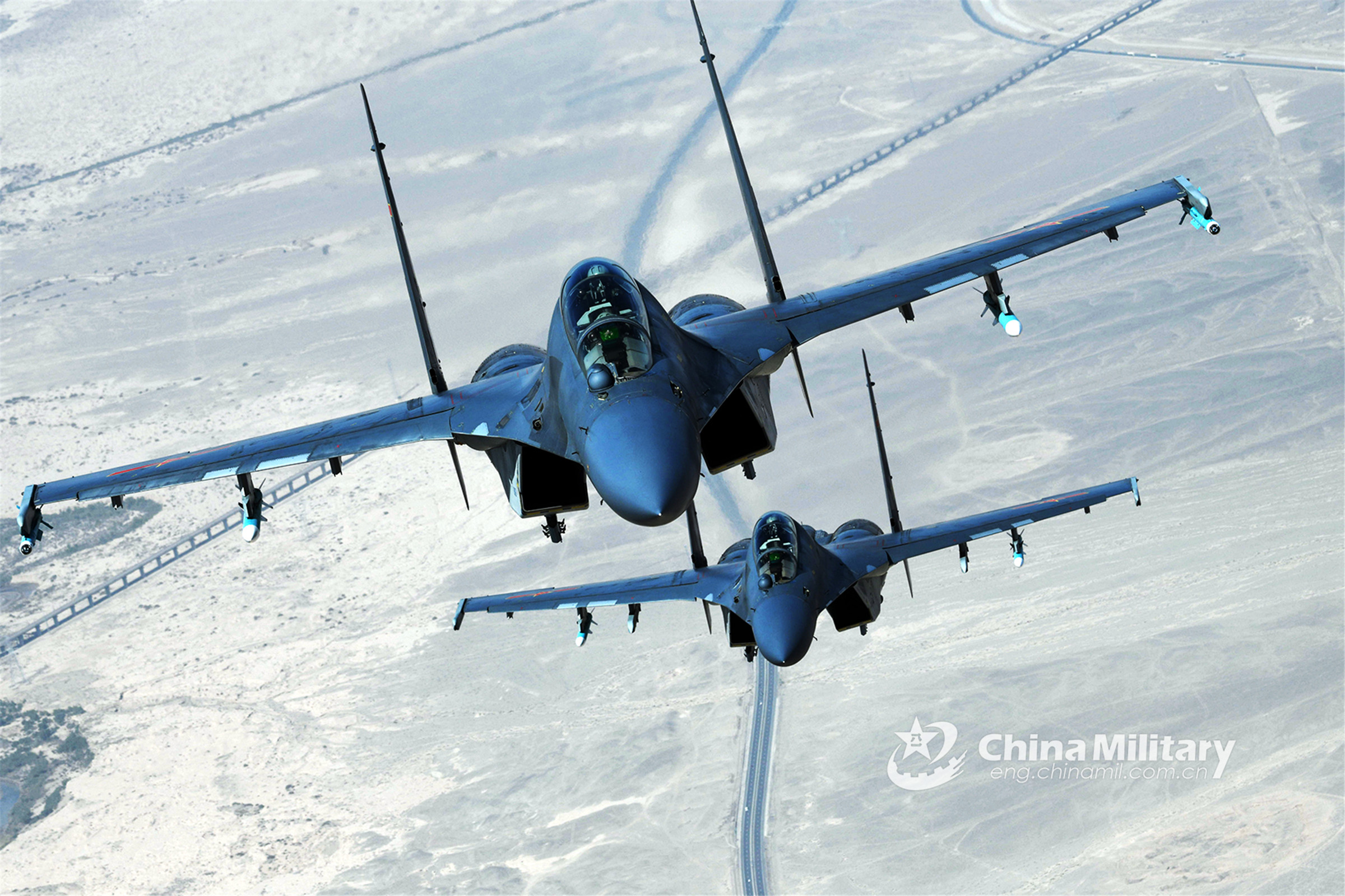 Two fighter jets attached to the PLA Air Force fly in combat formation over the plateau highway during a flight training exercise. (eng.chinamil.com.cn/Photo by Yu Hongchun)