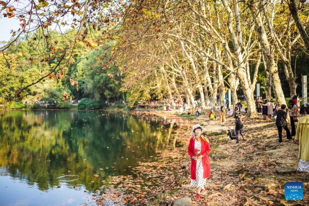 A woman poses for photos in Huaxi national city wetland park in Guiyang, capital of southwest China's Guizhou Province, Oct. 25, 2022. (Xinhua/Tao Liang)