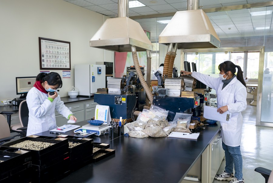 Staff members work at a coffee bean testing facility under Nestle in Pu'er of southwest China's Yunnan Province, on Feb. 22, 2022. (Xinhua/Chen Xinbo)