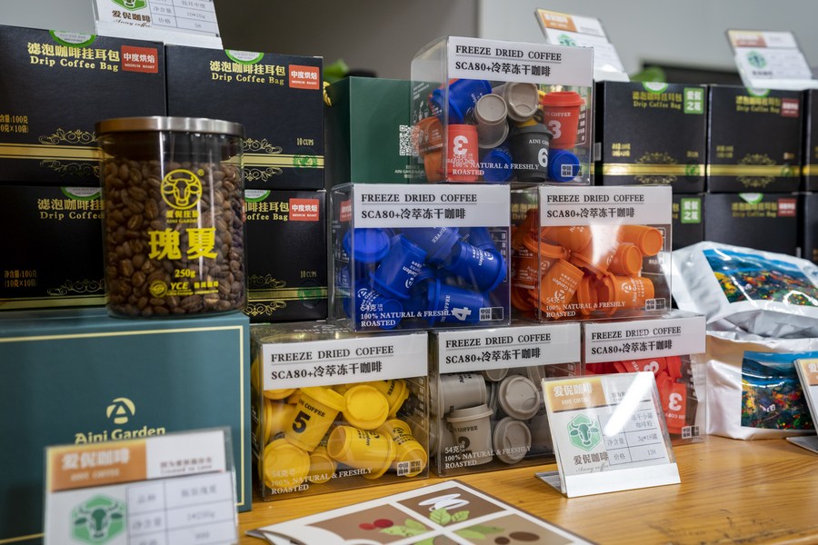 This photo taken on Feb. 22, 2022 shows some coffee products displayed at a local coffee company in Pu'er of southwest China's Yunnan Province. (Xinhua/Chen Xinbo)