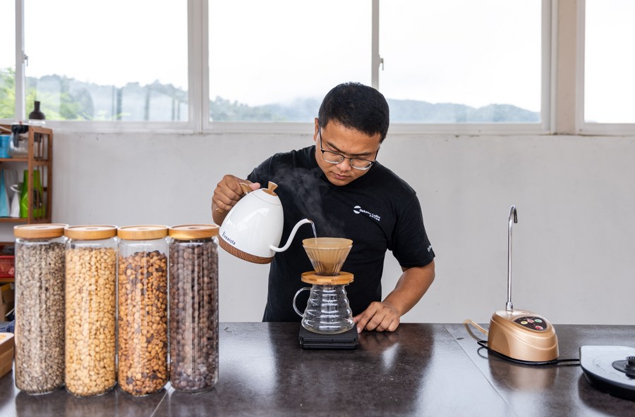 Yang Hongjian brews fresh coffee at his coffee estate in Pu'er of southwest China's Yunnan Province, on June 24, 2022. (Xinhua/Cao Mengyao)