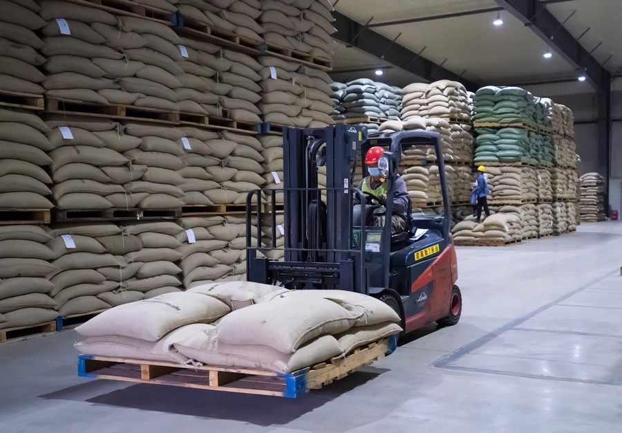 Staff members move bagged coffee beans at a storage warehouse under Nestle in Pu'er of southwest China's Yunnan Province, on Feb. 22, 2022. (Xinhua/Chen Xinbo)