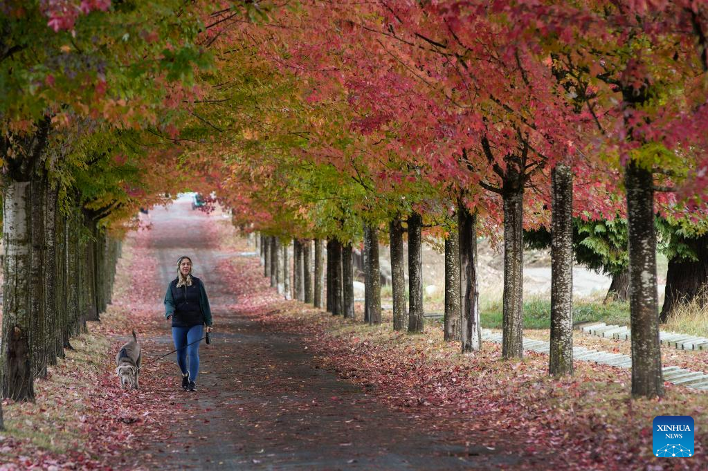 A woman walks a dog under a canopy of fall foliage along a street in Vancouver, Canada, on Oct. 26, 2022. (Photo by Liang Sen/Xinhua)
