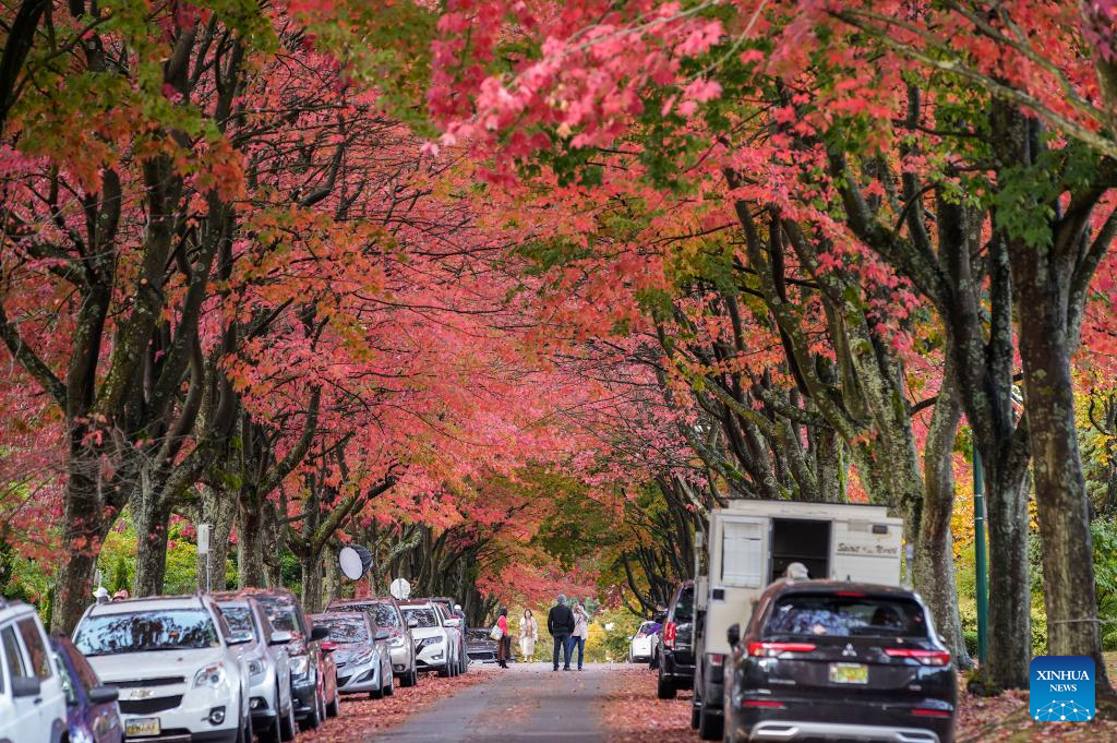 People walk under a canopy of fall foliage along a street in Vancouver, Canada, on Oct. 26, 2022. (Photo by Liang Sen/Xinhua)
