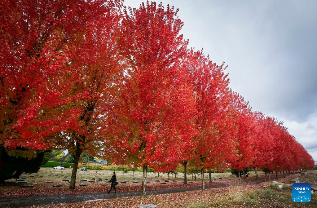 A woman walks under a canopy of fall foliage along a street in Vancouver, Canada, on Oct. 26, 2022. (Photo by Liang Sen/Xinhua)