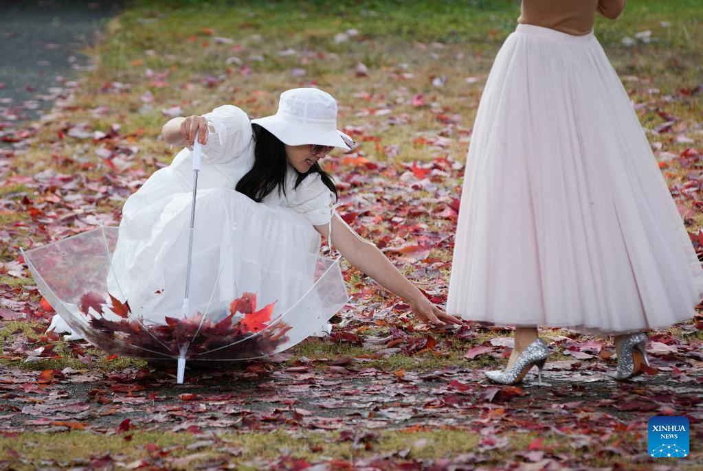 A woman collects red maple leaves from the ground in Vancouver, Canada, on Oct. 26, 2022. (Photo by Liang Sen/Xinhua)