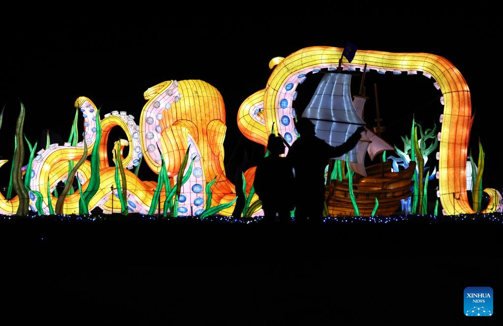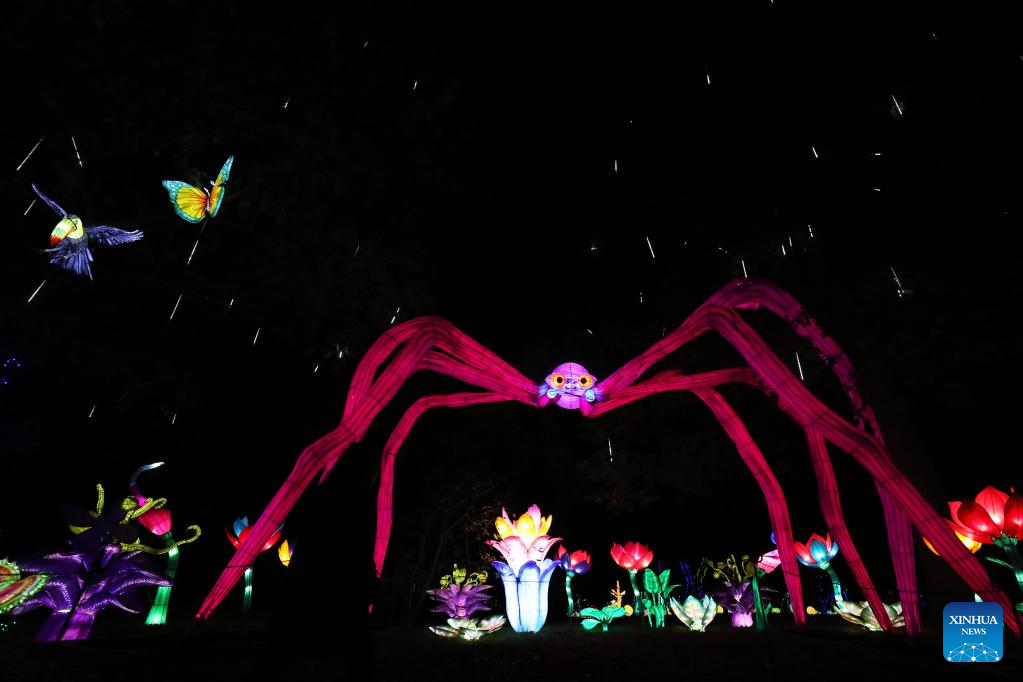 Illuminated sculptures are pictured during a media tour of a light festival at Thoiry zoo near Paris, France, Oct. 26, 2022. The festival will kick off here on Sunday, displaying around 2,000 illuminated sculptures. (Xinhua/Gao Jing)