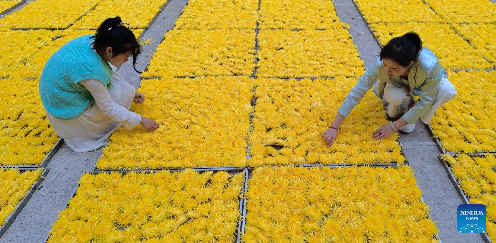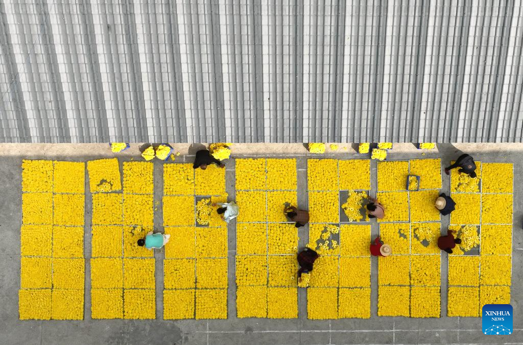 Villagers arrange chrysanthemums in Yuelin Village of Nanyue District, Hengyang City, central China's Hunan Province, Oct. 26, 2022. Chrysanthemums, which can be processed into chrysanthemum tea, have entered the harvest season here. (Xinhua/Zhao Zhongzhi)