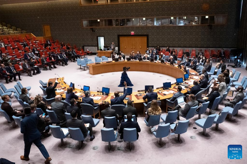 Photo taken on Oct. 27, 2022 shows a UN Security Council meeting at the UN headquarters in New York. The UN Security Council on Thursday adopted a resolution to renew the mandate of the UN Mission for the Referendum in Western Sahara (MINURSO) for another year, till Oct. 31, 2023. (Evan Schneider/UN Photo/Handout via Xinhua)