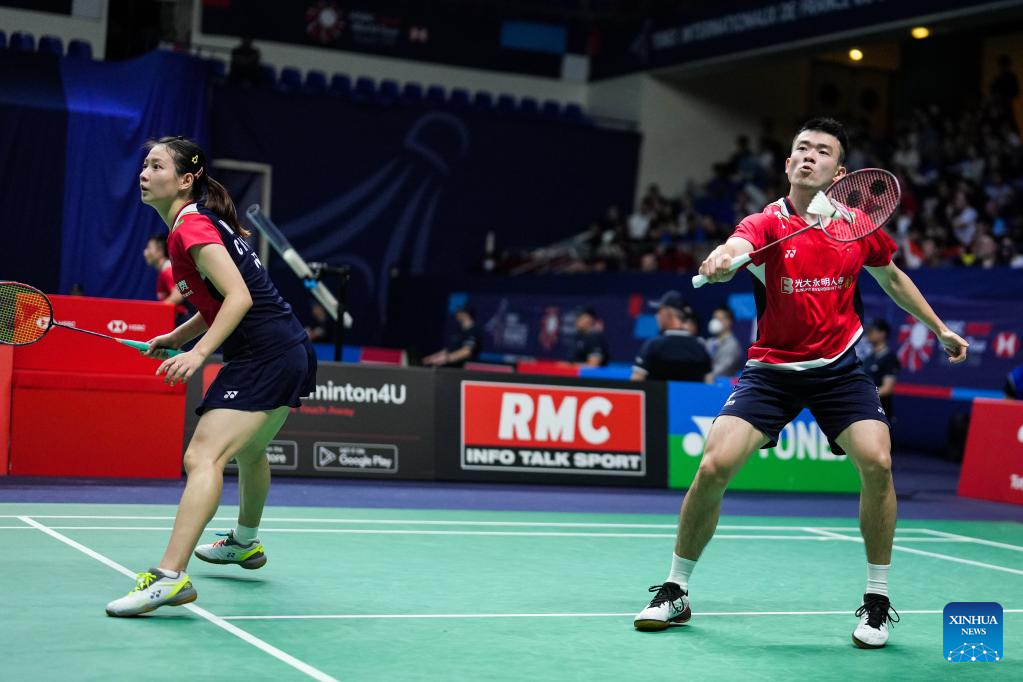 Zheng Siwei (R)/Huang Yaqiong compete during the mixed doubles round of 16 match between Zheng Siwei/Huang Yaqiong of China and Mathias Christiansen/Alexandra Boje of Denmark at the French Open 2022 badminton tournament in Paris, France, Oct. 27, 2022. (Photo by Tang Shi/Xinhua)