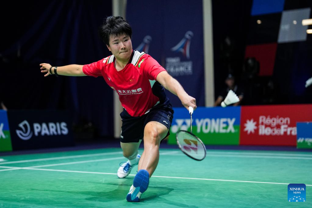 He Bingjiao of China hits a return during the women's singles round of 16 match against Mia Blichfeldt of Denmark at the French Open 2022 badminton tournament in Paris, France, Oct. 27, 2022. (Photo by Tang Shi/Xinhua)