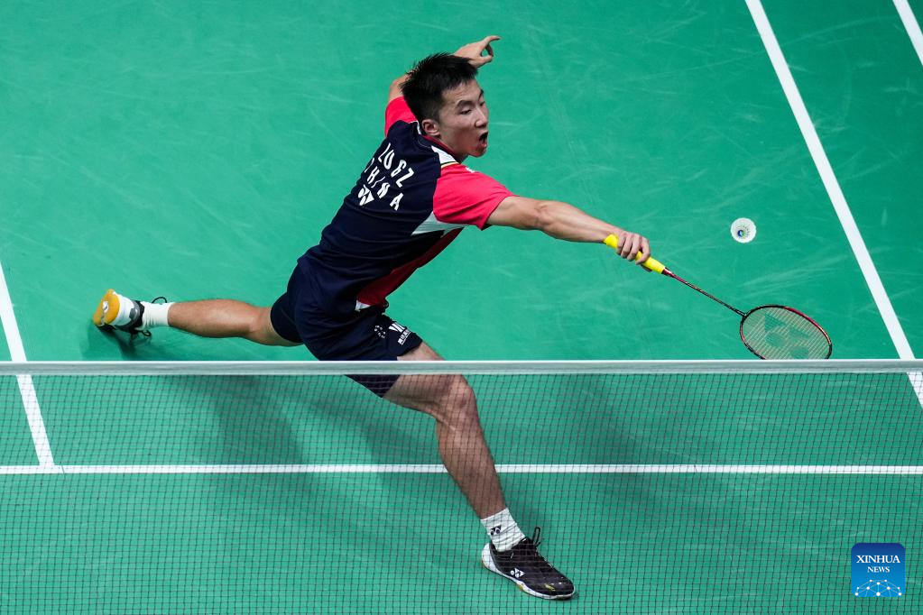 Lu Guangzu competes during the men's singles round of 16 match between Lu Guangzu of China and Prannoy Haseena Sunil of India at the French Open 2022 badminton tournament in Paris, France, Oct. 27, 2022. (Photo by Tang Shi/Xinhua)