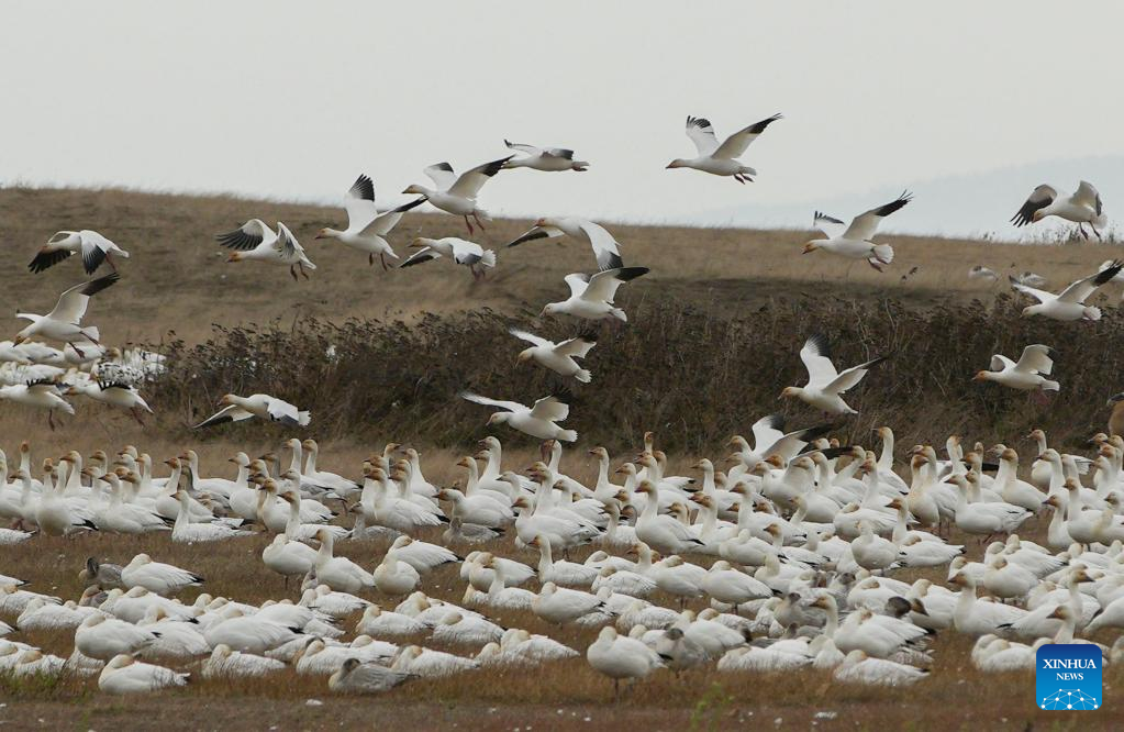 Snow geese are seen at Garry Point Park in Richmond, British Columbia, Canada, on Oct. 27, 2022. (Photo by Liang Sen/Xinhua)