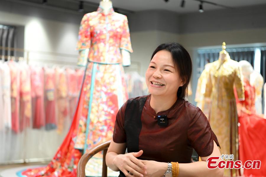 Tailor Wong introduces her passion for traditional Chinese wedding dress "Longfeng Gua" in Shunde, south China's Guangdong Province. (Photo: China News Service/Chen Jimin)