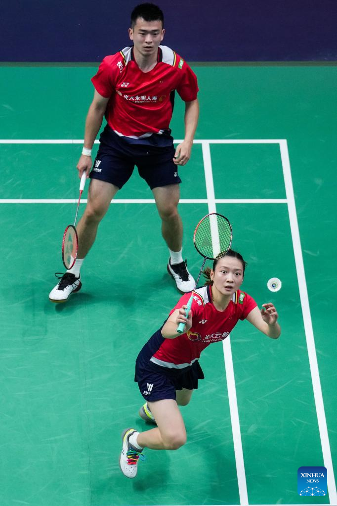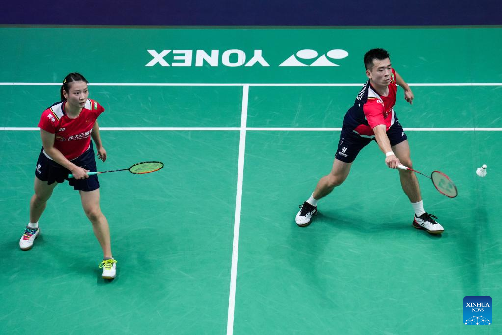 Zheng Siwei(top)/Huang Yaqiong compete during the mixed doubles quarterfinal match between Zheng Siwei/Huang Yaqiong of China and Kaneko Yuki/Matsutomo Misaki of Japan at the French Open 2022 badminton tournament in Paris, France, Oct. 28, 2022. (Photo by Tang Shi/Xinhua)