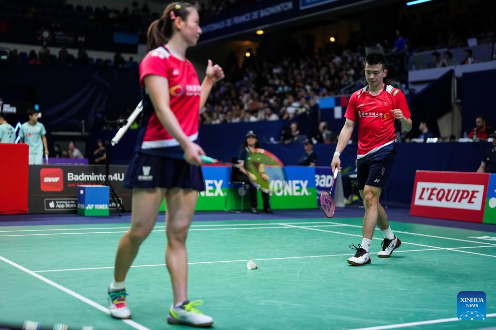 Zheng Siwei(R)/Huang Yaqiong react during the mixed doubles quarterfinal match between Zheng Siwei/Huang Yaqiong of China and Kaneko Yuki/Matsutomo Misaki of Japan at the French Open 2022 badminton tournament in Paris, France, Oct. 28, 2022. (Photo by Tang Shi/Xinhua)