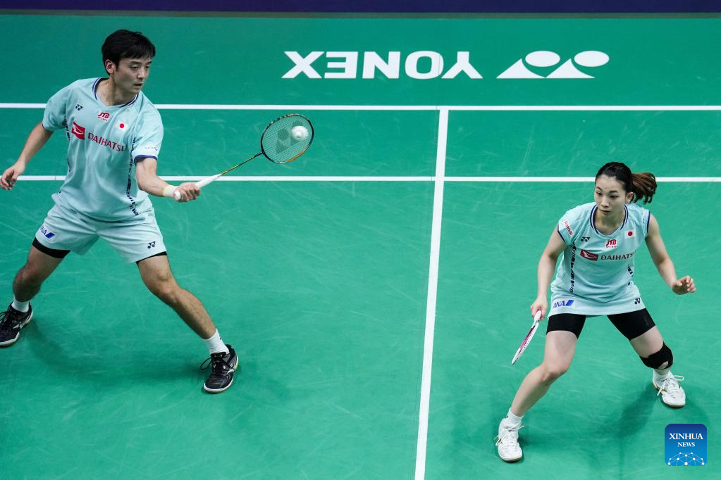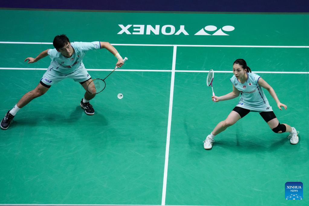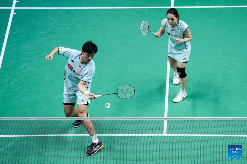 Kaneko Yuki(L)/Matsutomo Misaki compete during the mixed doubles quarterfinal match between Zheng Siwei/Huang Yaqiong of China and Kaneko Yuki/Matsutomo Misaki of Japan at the French Open 2022 badminton tournament in Paris, France, Oct. 28, 2022. (Photo by Tang Shi/Xinhua)
