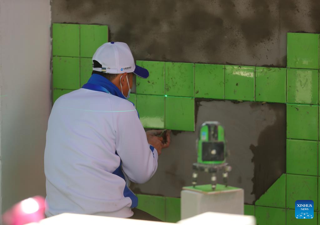 A contestant participates in the contest of wall tiling during the 1st Vocational Skills Competition of Liaoning Province in Shenyang, northeast China's Liaoning Province, Oct. 27, 2022.