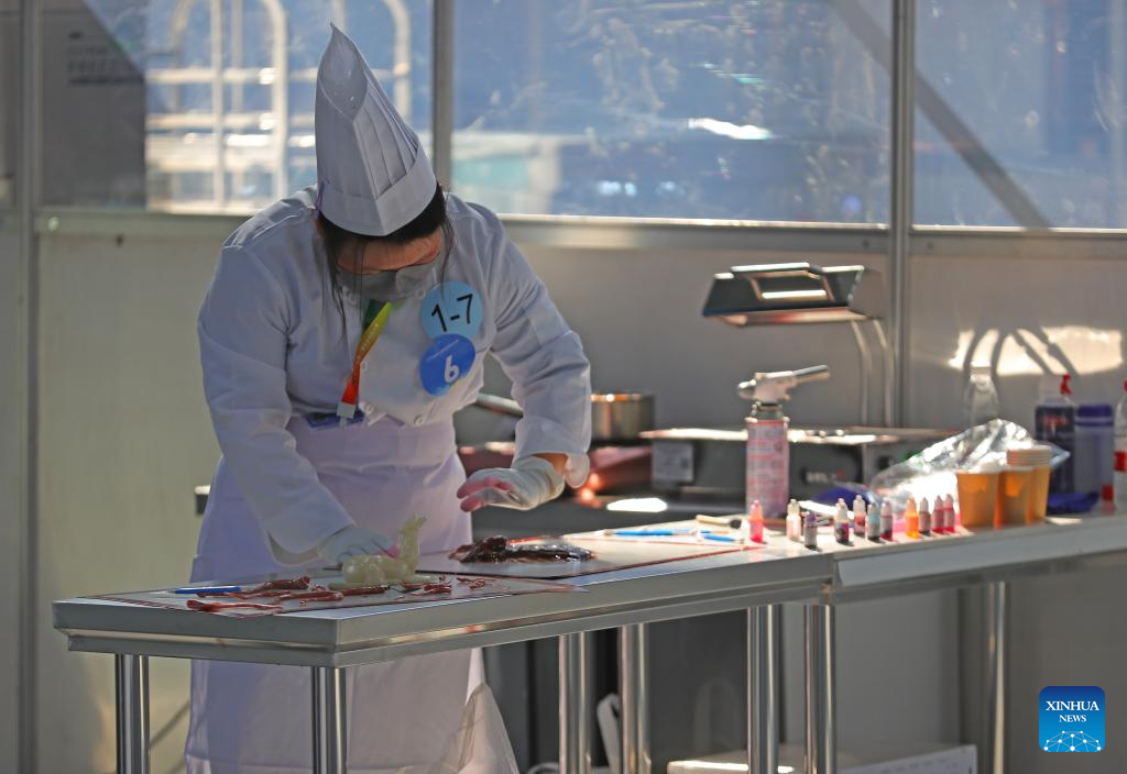 A contestant participates in the contest of sugar art or bakery during the 1st Vocational Skills Competition of Liaoning Province in Shenyang, northeast China's Liaoning Province, Oct. 27, 2022.