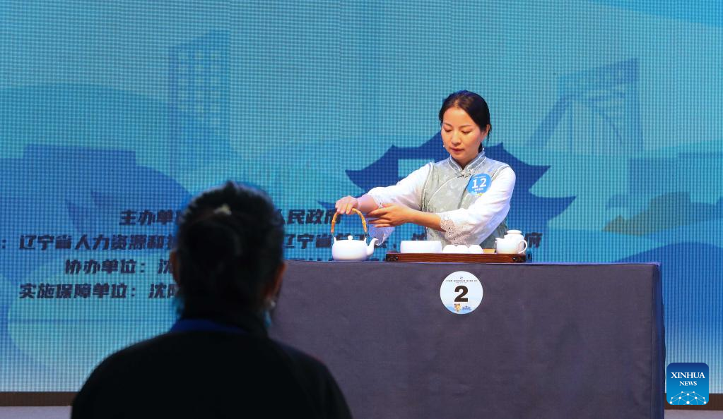 A contestant participates in the contest of tea art during the 1st Vocational Skills Competition of Liaoning Province in Shenyang, northeast China's Liaoning Province, Oct. 27, 2022.