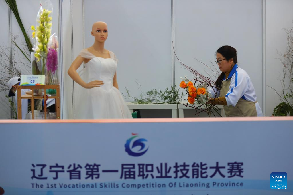 The competition kicked off in Shenyang on Thursday, with more than 1,600 contestants competing in flower arrangement, hairdressing, industrial internet engineering technology, unmanned aerial vehicle installation and maintenance, benchwork, furniture making, wall tiling and other contests. (Xinhua/Yang Qing)