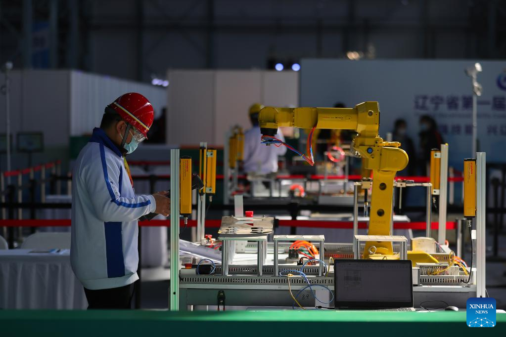 A contestant participates in the contest of industrial robot system maintenance during the 1st Vocational Skills Competition of Liaoning Province in Shenyang, northeast China's Liaoning Province, Oct. 27, 2022.