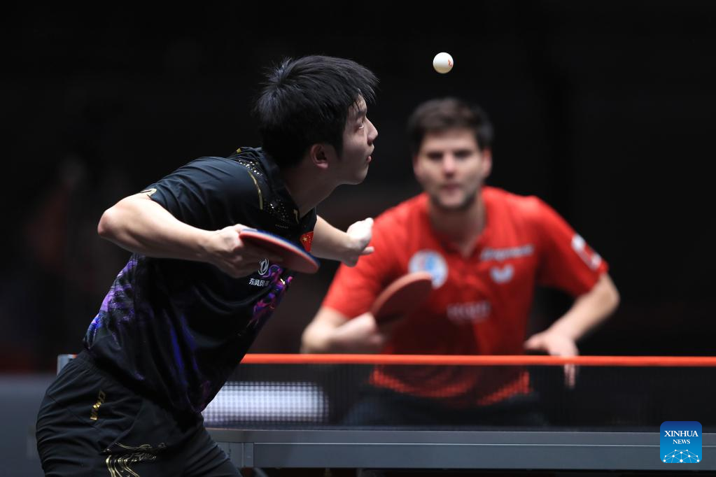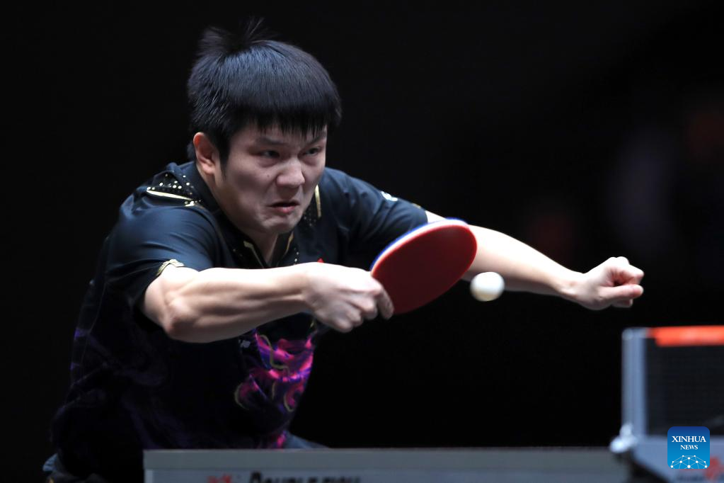 Fan Zhendong of China hits a return during the men's singles quarterfinal match against Dimitrij Ovtcharov of Germany at the WTT Cup Finals in Xinxiang, central China's Henan Province, Oct. 28, 2022. (Photo by Gao Zhiyong/Xinhua)