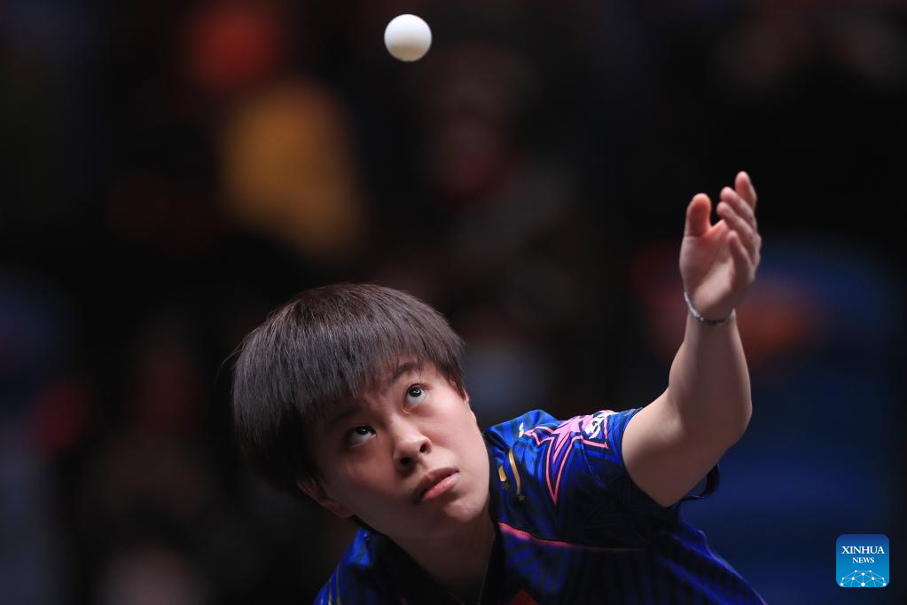 Sun Yingsha of China serves during the women's singles quarterfinal match against Ishikawa Kasumi of Japan at the WTT Cup Finals in Xinxiang, central China's Henan Province, Oct. 28, 2022. (Photo by Gao Zhiyong/Xinhua)