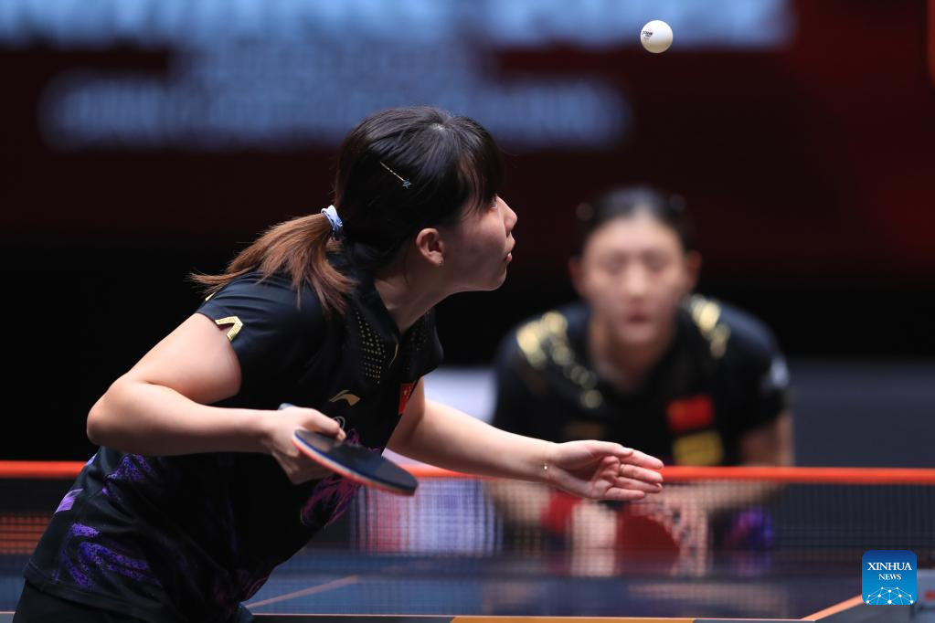 Wang Manyu (L) of China hits a return during the women's singles quarterfinal match against Ito Mima of Japan at the WTT Cup Finals in Xinxiang, central China's Henan Province, Oct. 28, 2022. (Photo by Gao Zhiyong/Xinhua)