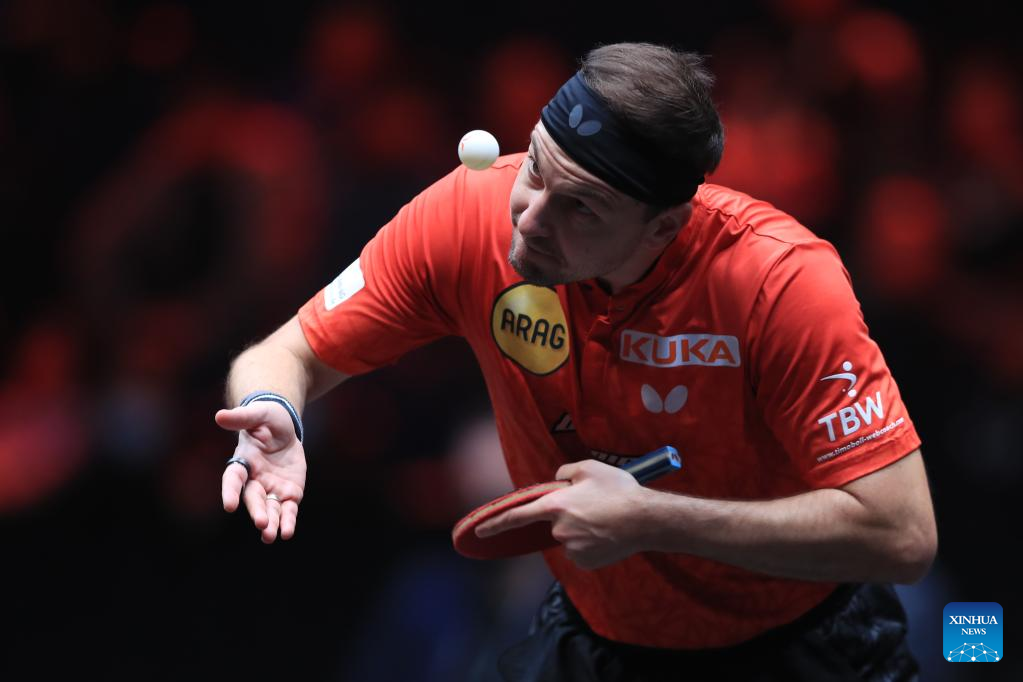 Timo Boll of Germany serves during the men's singles quarterfinal match against Harimoto Tomokazu of Japan at the WTT Cup Finals in Xinxiang, central China's Henan Province, Oct. 28, 2022. (Photo by Gao Zhiyong/Xinhua)