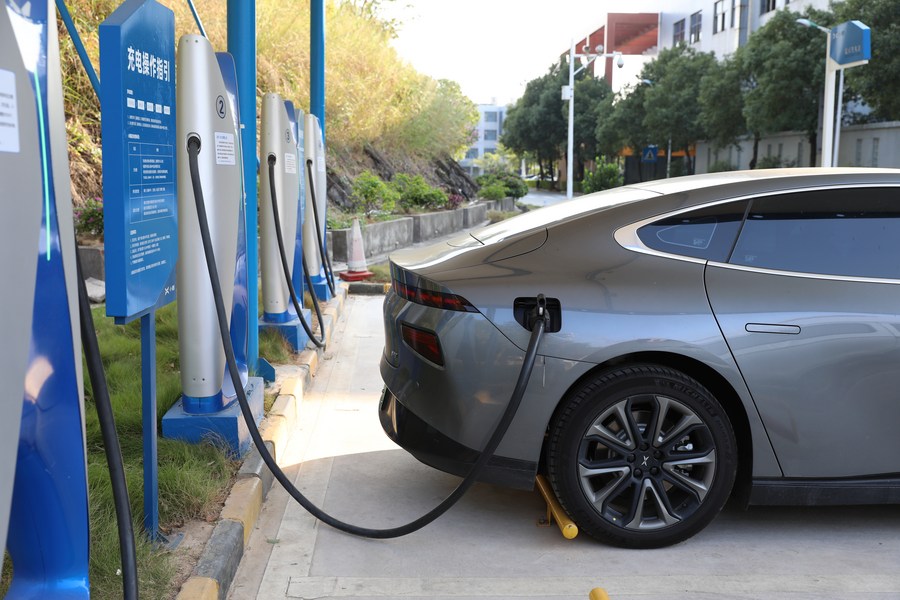 A new energy vehicle is seen charging at a service area along the Guangzhou-Shenzhen expressway in south China's Guangdong Province, Oct. 27, 2022. (Xinhua/Li Jiale)