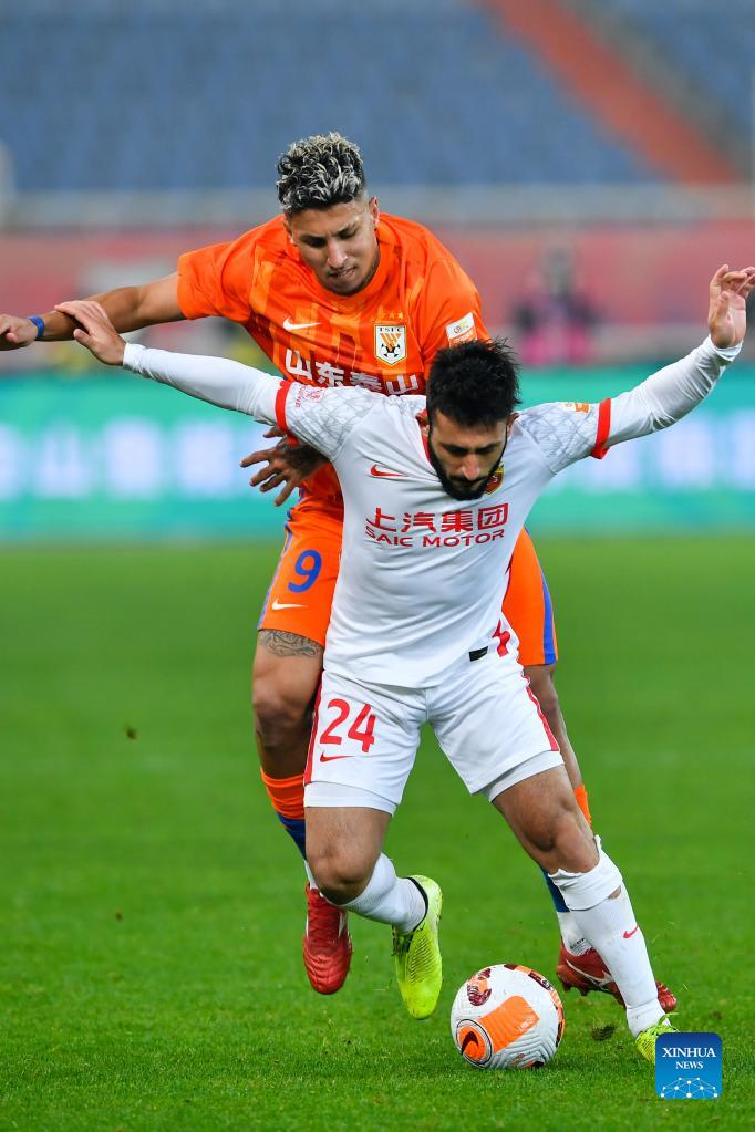 Crysan (top) of Shandong Taishan vies with Matias Vargas of Shanghai Port during their 2022 season Chinese Football Association Super League (CSL) match in Jinan, capital of east China's Shandong Province, Oct. 30, 2022. (Xinhua/Zhu Zheng)