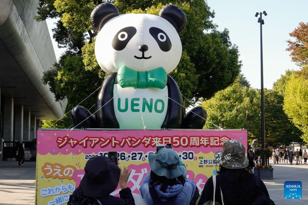 People take photos of a panda-shaped balloon, commemorating the 50th anniversary of the arrival of Chinese giant pandas, at the exit of Ueno station in Tokyo, Japan, Oct. 28, 2022. To mark the 50th anniversary of the arrival of Chinese giant pandas in Japan, Tokyo's Ueno Zoo has recently set up a "Giant Panda Post Office". (Xinhua/Zhang Xiaoyu)