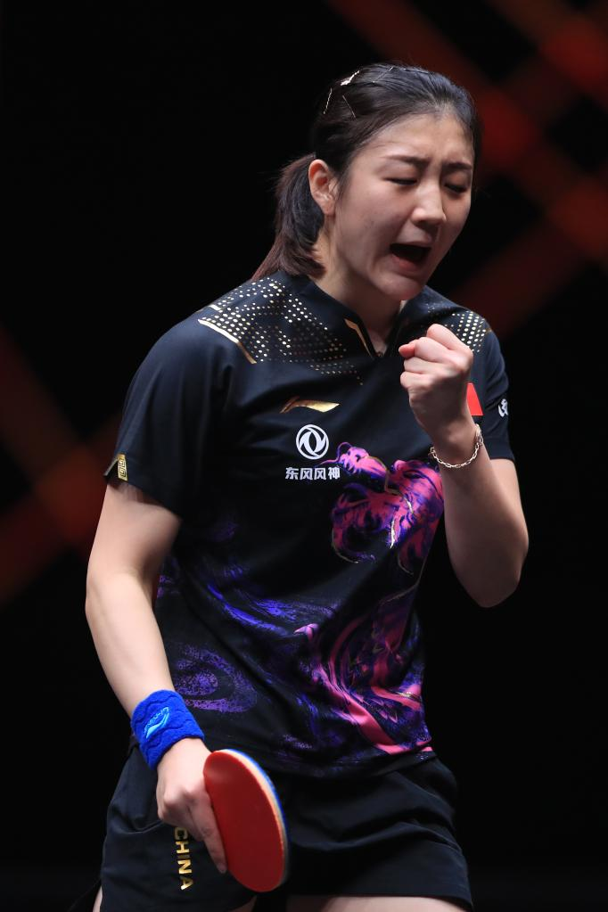 Chen Meng of China celebrates scoring during the women's singles semifinal match against her teammate Wang Manyu at the WTT Cup Finals in Xinxiang, central China's Henan Province, Oct. 29, 2022. (Photo by Gao Zhiyong/Xinhua)