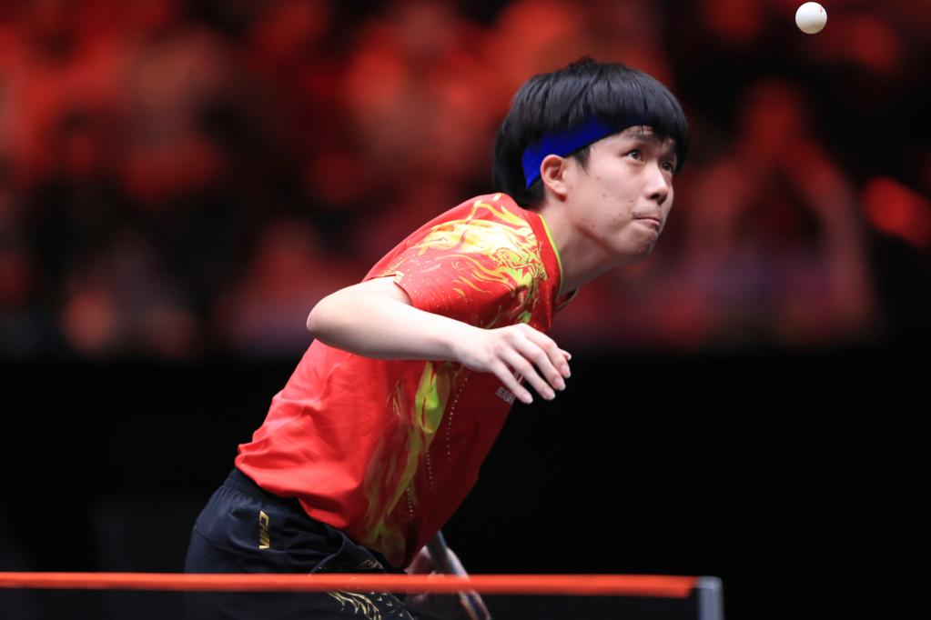 Wang Chuqin of China returns the ball during the men's singles semifinal match against his teammate Ma Long at the WTT Cup Finals in Xinxiang, central China's Henan Province, Oct. 29, 2022. (Photo by Gao Zhiyong/Xinhua)