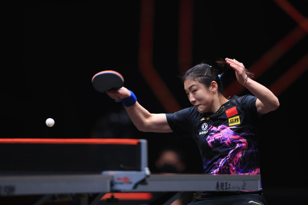 Chen Meng of China returns the ball during the women's singles semifinal match against her teammate Wang Manyu at the WTT Cup Finals in Xinxiang, central China's Henan Province, Oct. 29, 2022. (Photo by Gao Zhiyong/Xinhua)