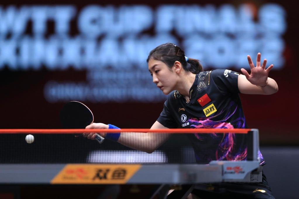 Wang Manyu of China returns the ball during the women's singles semifinal match against her teammate Chen Meng at the WTT Cup Finals in Xinxiang, central China's Henan Province, Oct. 29, 2022. (Photo by Gao Zhiyong/Xinhua)