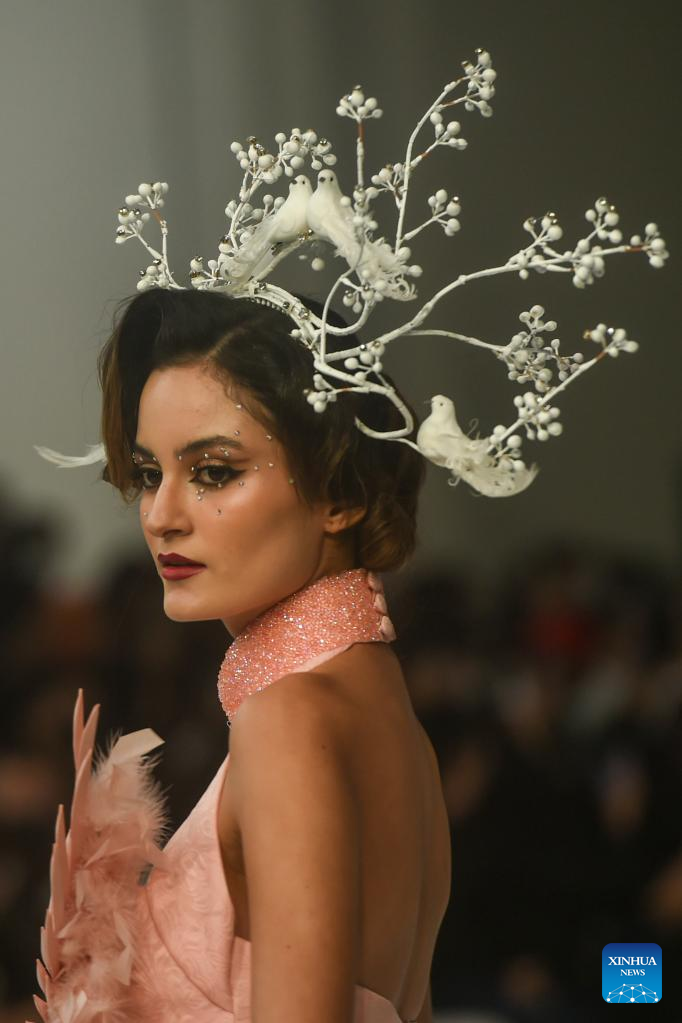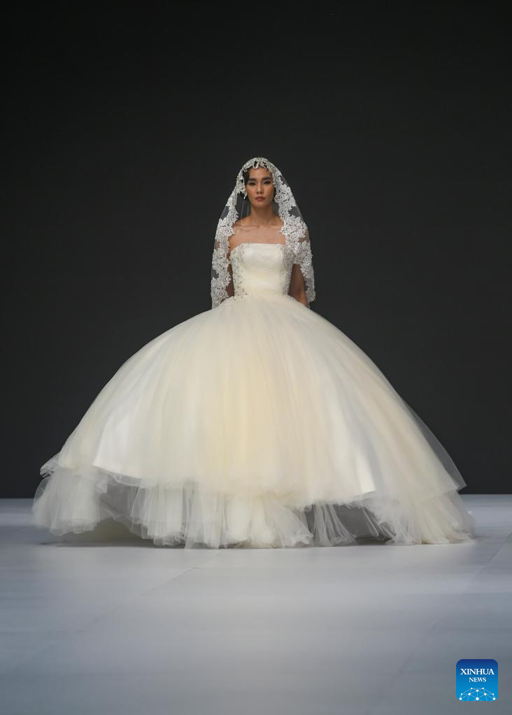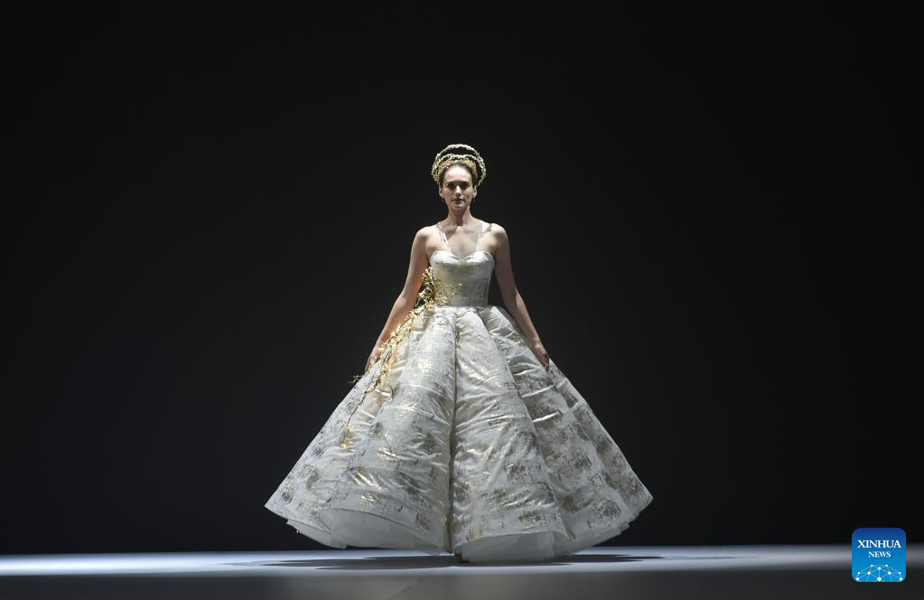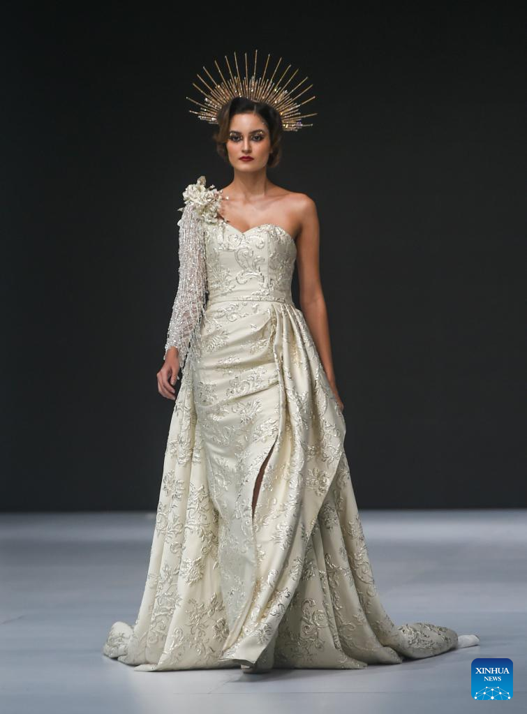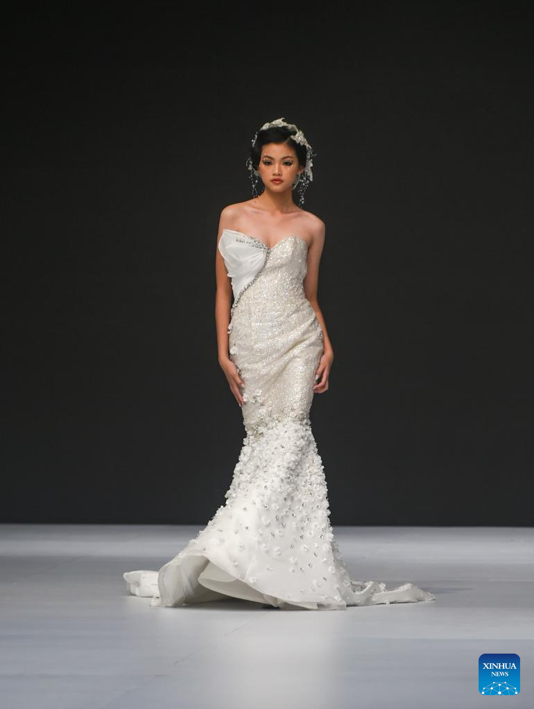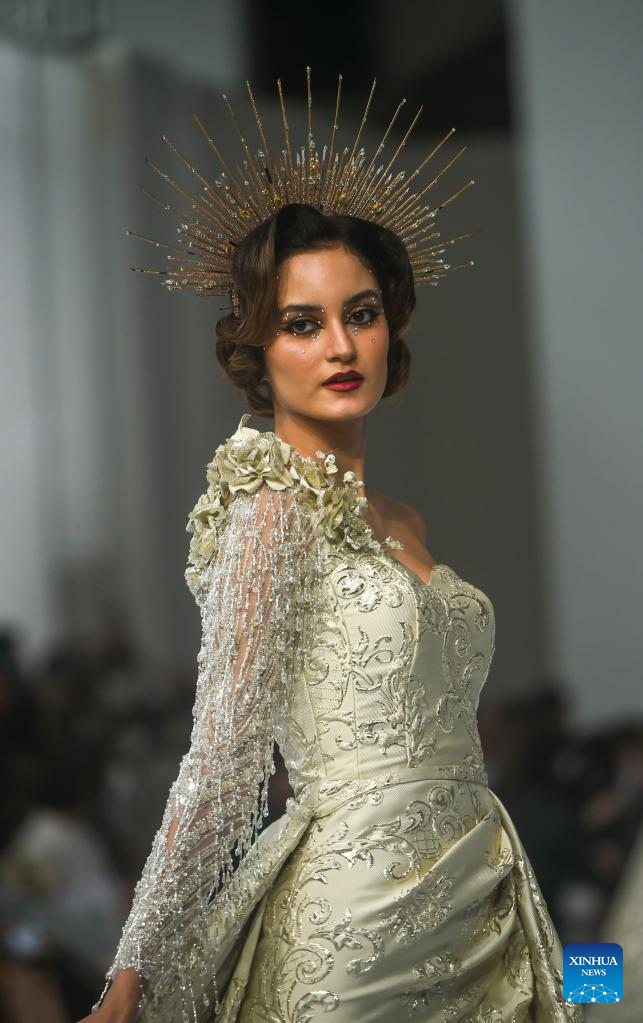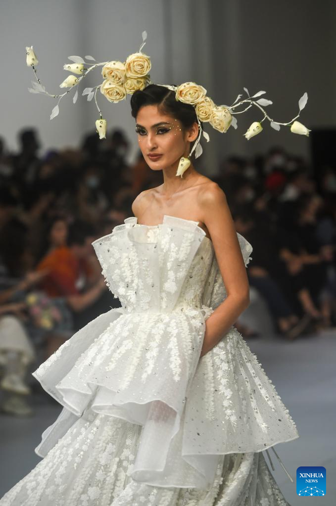 A model presents a creation at a show entitled "The Kingdom" presented by Abineri Ang during the Jakarta Fashion Week 2023 in Jakarta, Indonesia, Oct. 29, 2022. (Xinhua/Zulkarnain)