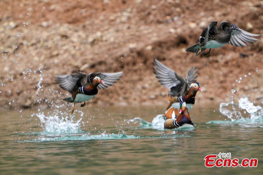 A flock of Mandarin ducks fly over the Diluo lake in Jiangkou County of Tongren City, southwest China's Guizhou Province. Migrant Mandarin ducks enjoy winter in Guizhou. (Photo: China News Service/Li He)
