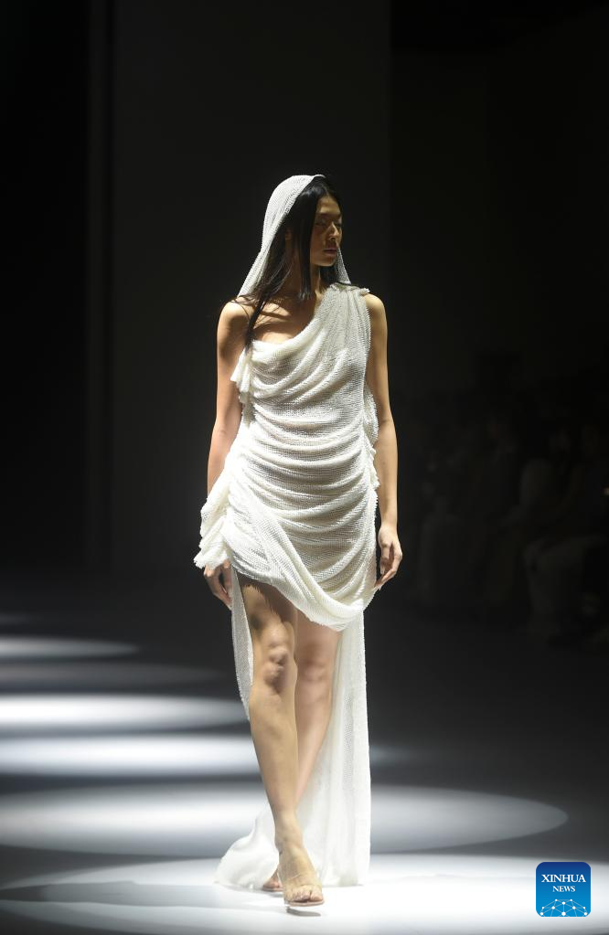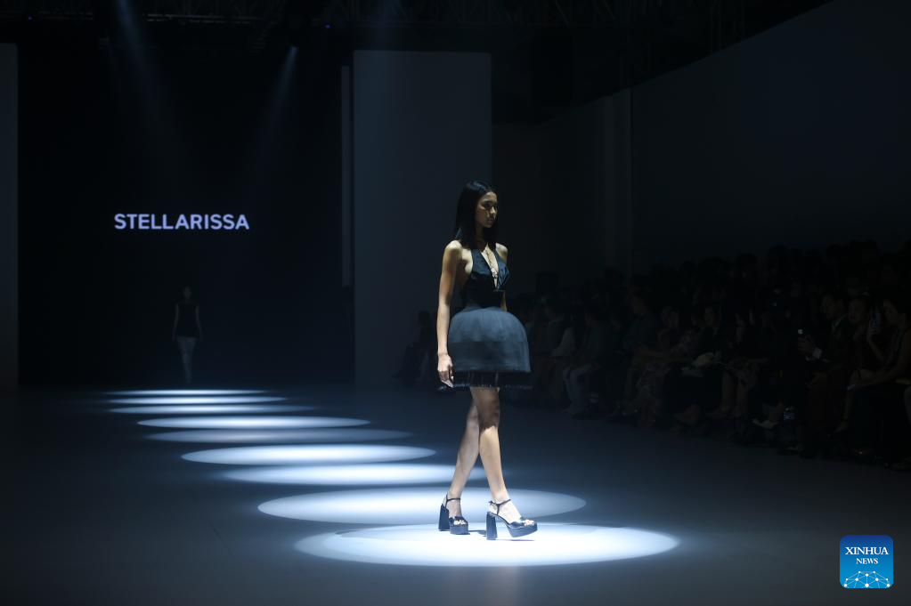 A model presents a creation by designer Stella Rissa during the last day of the Jakarta Fashion Week 2023 in Jakarta, Indonesia, Oct. 30, 2022. (Xinhua/Zulkarnain)