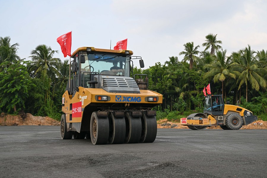 Staff members work at the construction site of the road network at the Wenchang International Aerospace City in Wenchang, south China's Hainan Province, Sept. 14, 2022. (Xinhua/Pu Xiaoxu)