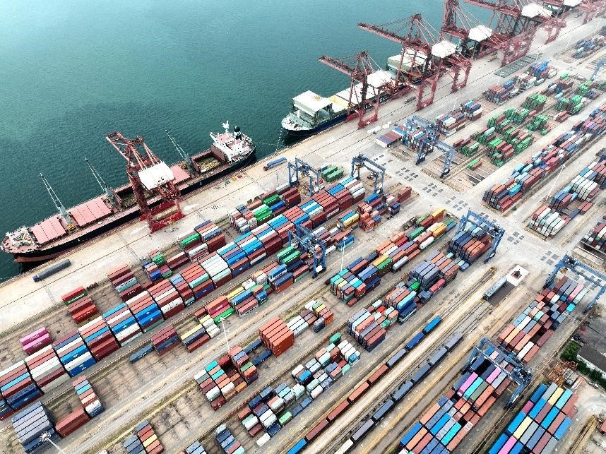 Containers are being handled at a terminal of the Lianyungang port, east China's Jiangsu Province, Aug. 8, 2022. Since this year, the Lianyungang port has fully leveraged its advantages in integrated transport development and rail-ocean intermodal transport, to promote high-quality development China-Europe freight trains. (People's Daily Online/Wang Chun)