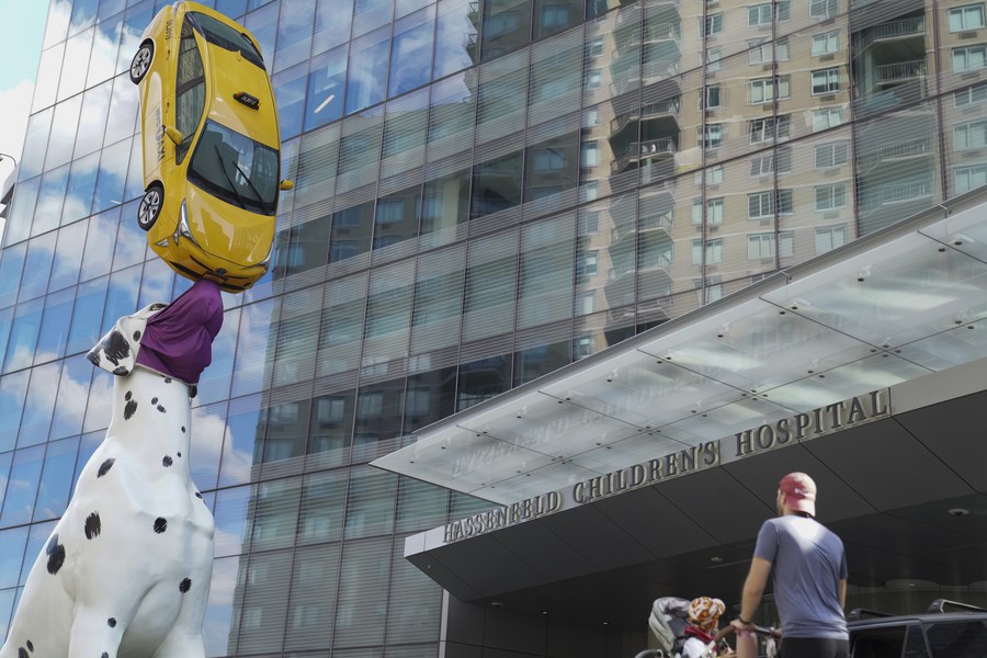 A dog sculpture with a face mask is seen outside a hospital in New York, the United States, Sept. 6, 2021. (Xinhua/Wang Ying)