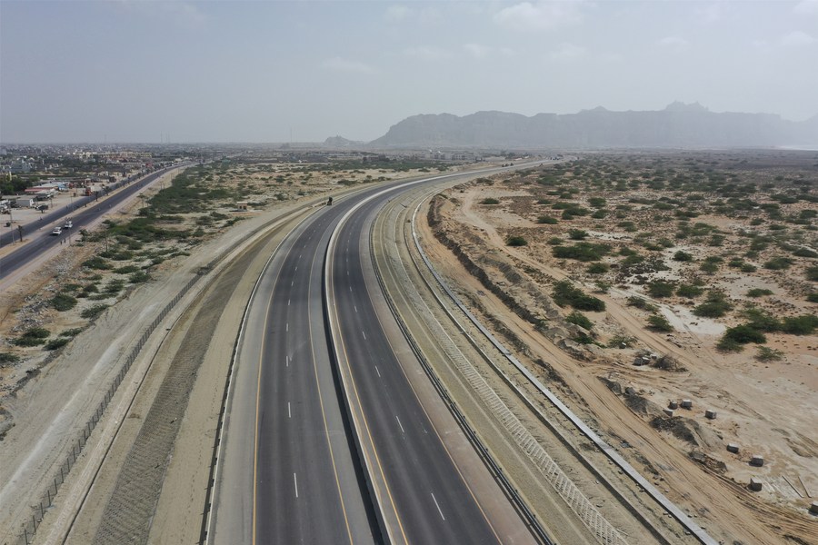 Aerial photo taken on June 3, 2022 shows a section of the China-aided Eastbay Expressway of Gwadar port in Gwadar of Pakistan's southwest Balochistan province. (Xinhua/Jiang Chao)